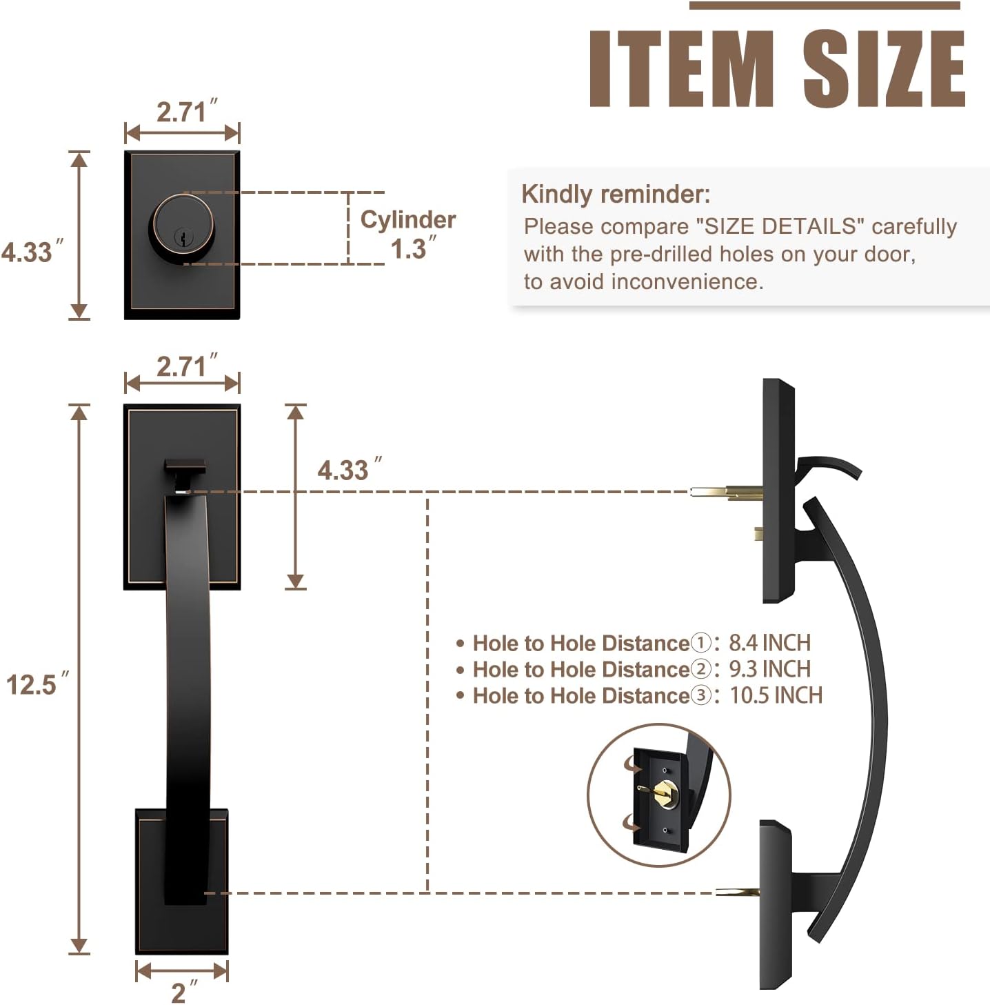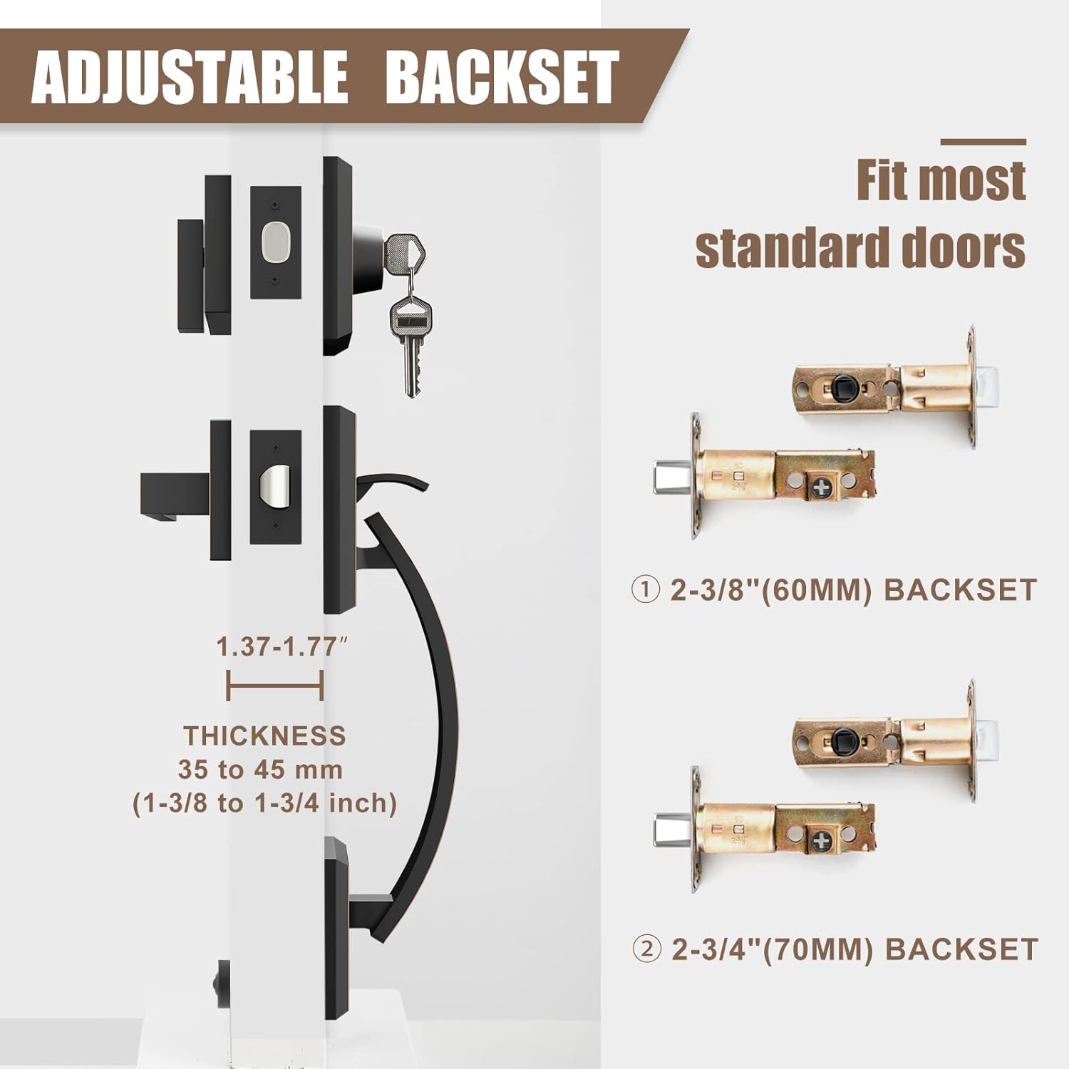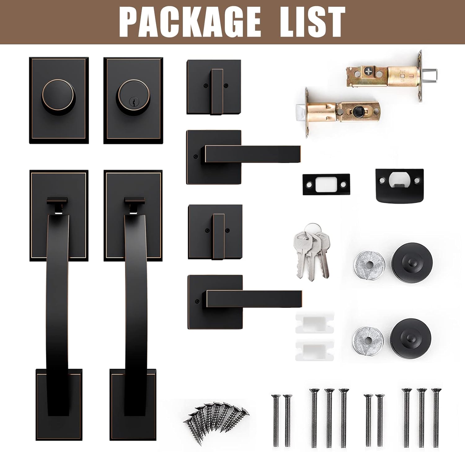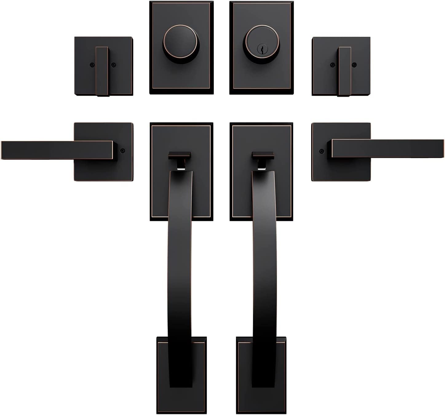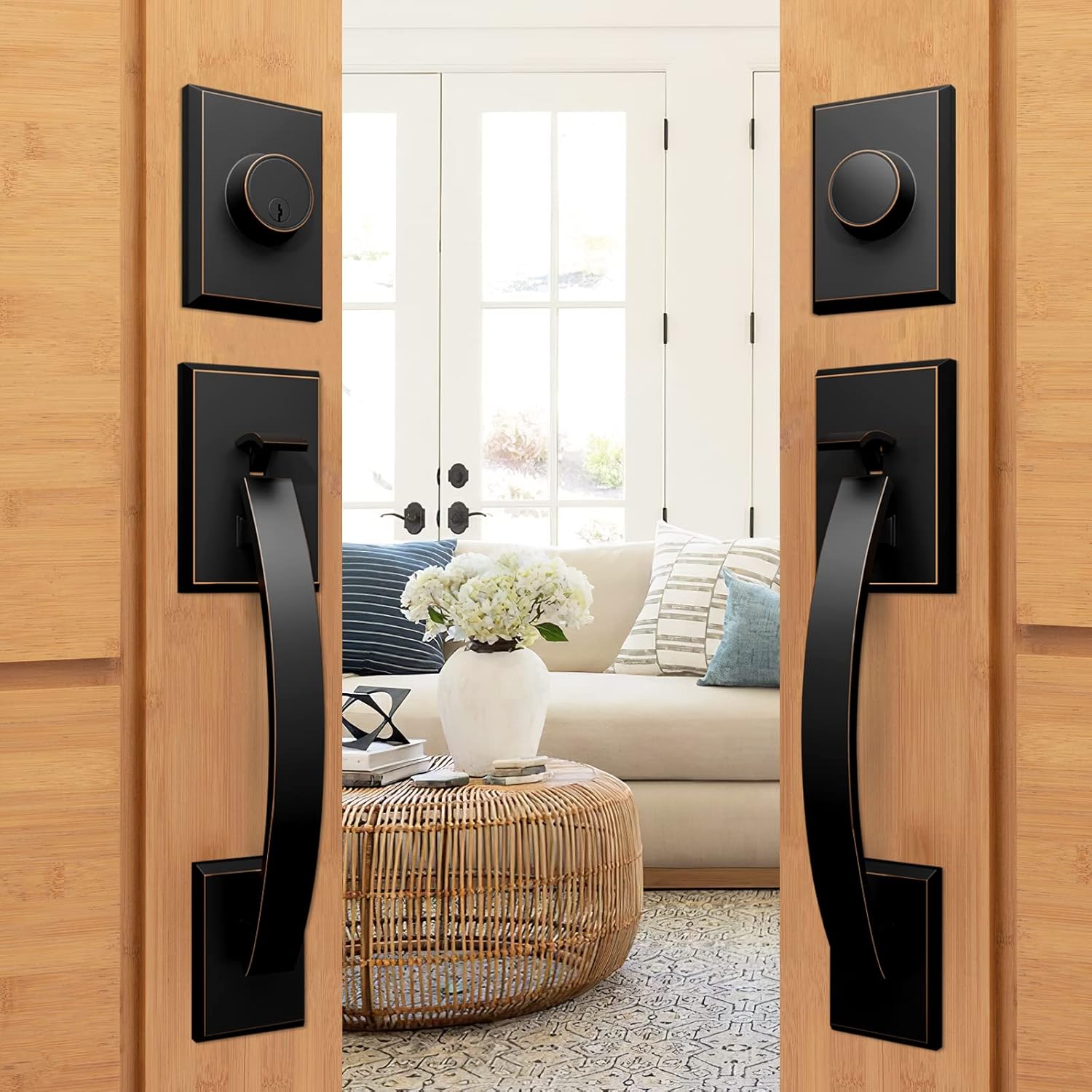 This premium double door handle set is designed to keep your front door secure while adding a touch of elegance to your homeâs exterior. Featuring a durable zinc alloy finish, it ensures long-lasting strength and resilience against wear and tear. The oil rë¯ bronze option offers a timeless, sophisticated look that complements traditional and modern home designs alike. The adjustable design adapts to various door thicknesses, making installation seamless and precise. With all necessary components includedâdeadbolts, handles, latches, and strike platesâyouâll have everything you need for a hassle-free setup.