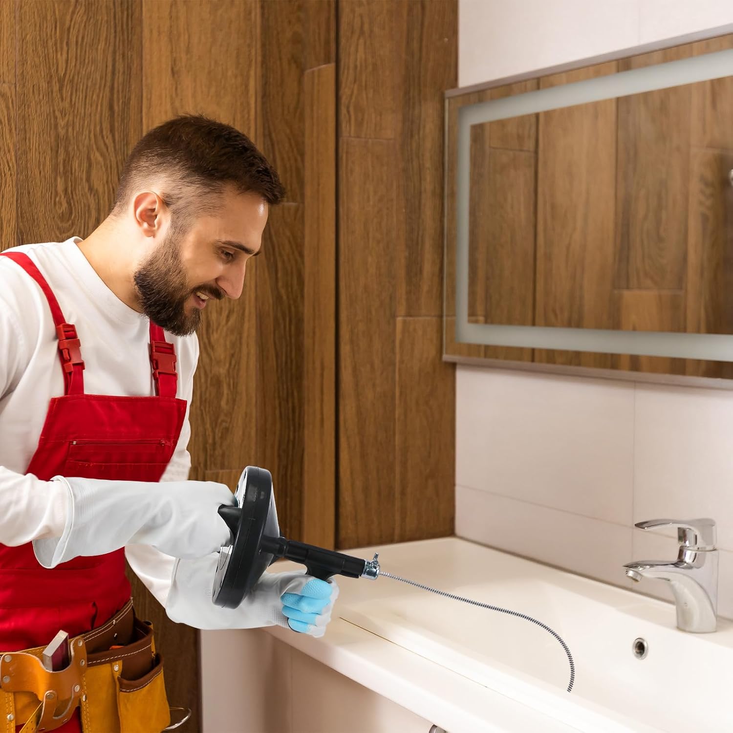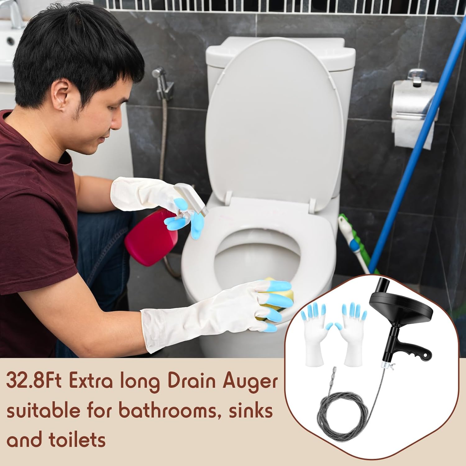 Say goodbye to clogged drains and messy solutions with the Threlaco Drain Auger 32.8ft. This heavy-duty steel pipe cleaner is designed to tackle the toughest clogs in sinks, showers, and bathtubs. Equipped with durable gloves, it ensures safe and comfortable use in tight spaces while its flexible spring steel can reach even the deepest buildup of hair and food.