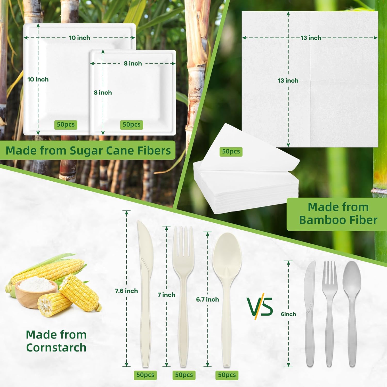 Introducing our 300-piece compostable plate set, designed to bring convenience and sustainability to your next gathering. Made from renewable materials like sugarcane fiber and cornstarch, these disposable plates and utensils are strong, durable, and wonât break or warp, making them perfect for any occasion.