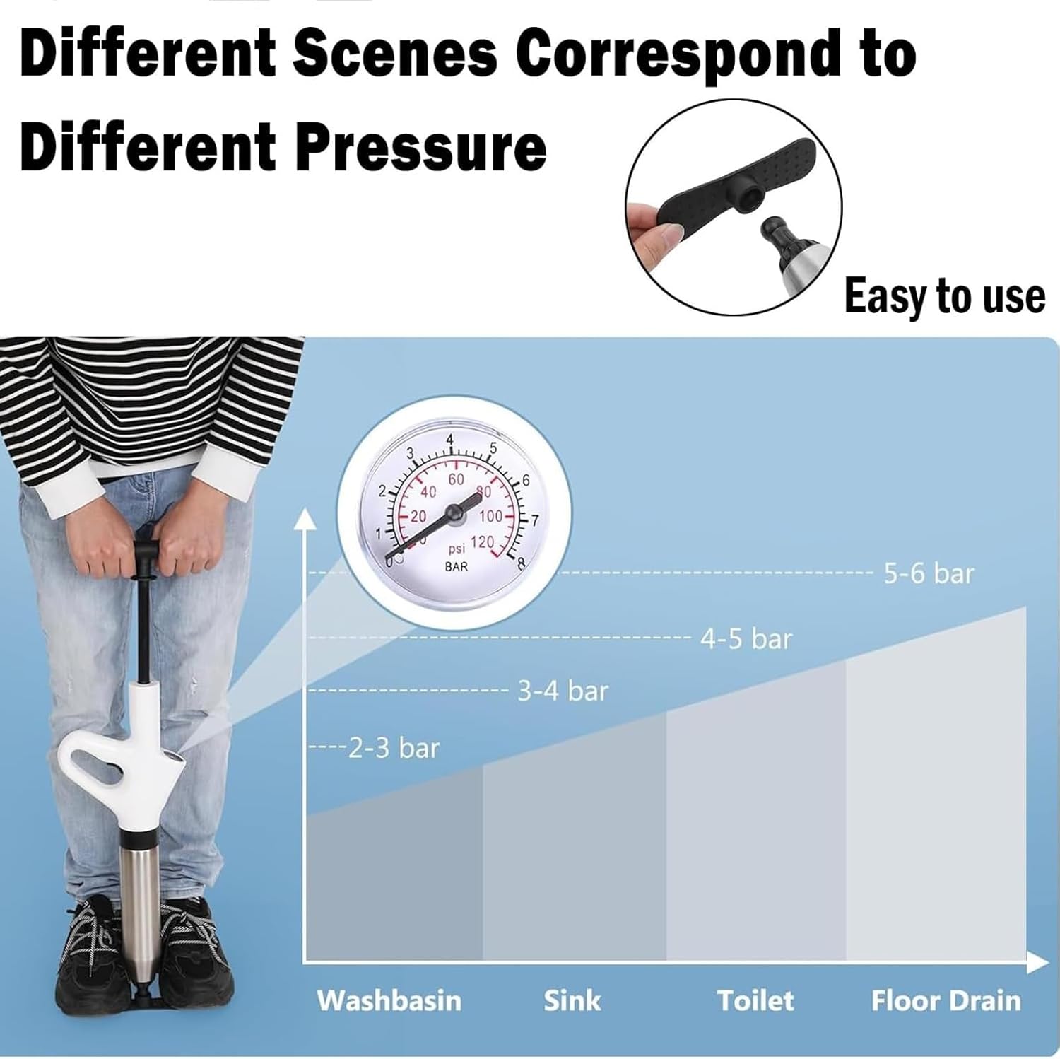 With built-in pressure control, this tool adjusts its force between 0-8 Bar, giving you a visual barometer for optimal performance. You can confidently tackle even the toughest clogs, like hair, debris, and small plumbing errors, without the hassle of manual effort or the risk of over-pressurizing your pipes.