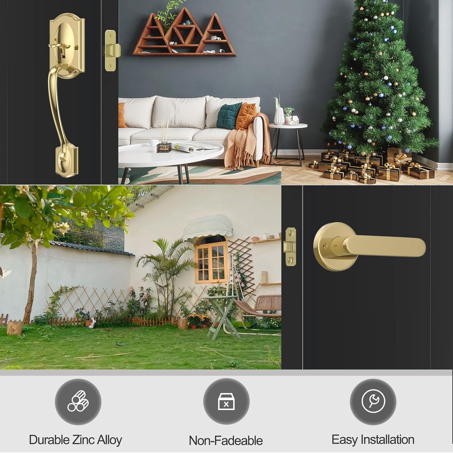 This front door handle set combines exceptional durability with a sleek, modern appearance. Built from zinc alloy, itâs designed to withstand wear and tear while maintaining its polished brass finish. The ease of installation and maintenance makes it ideal for both DIY enthusiasts and professional installers. With a 30-day refund period and 3-month replacement for natural damage, you can trust in the productâs quality and your satisfaction.