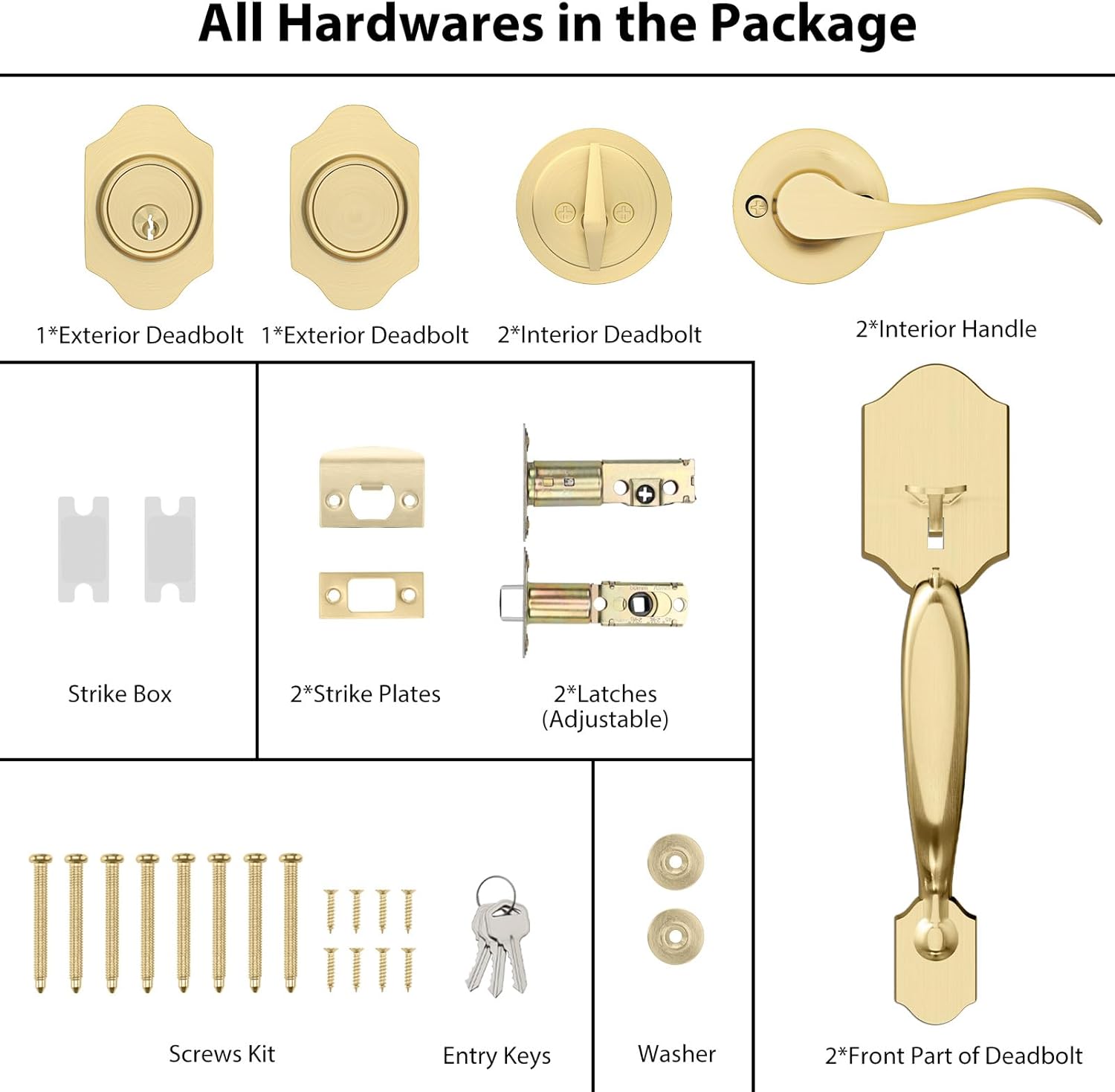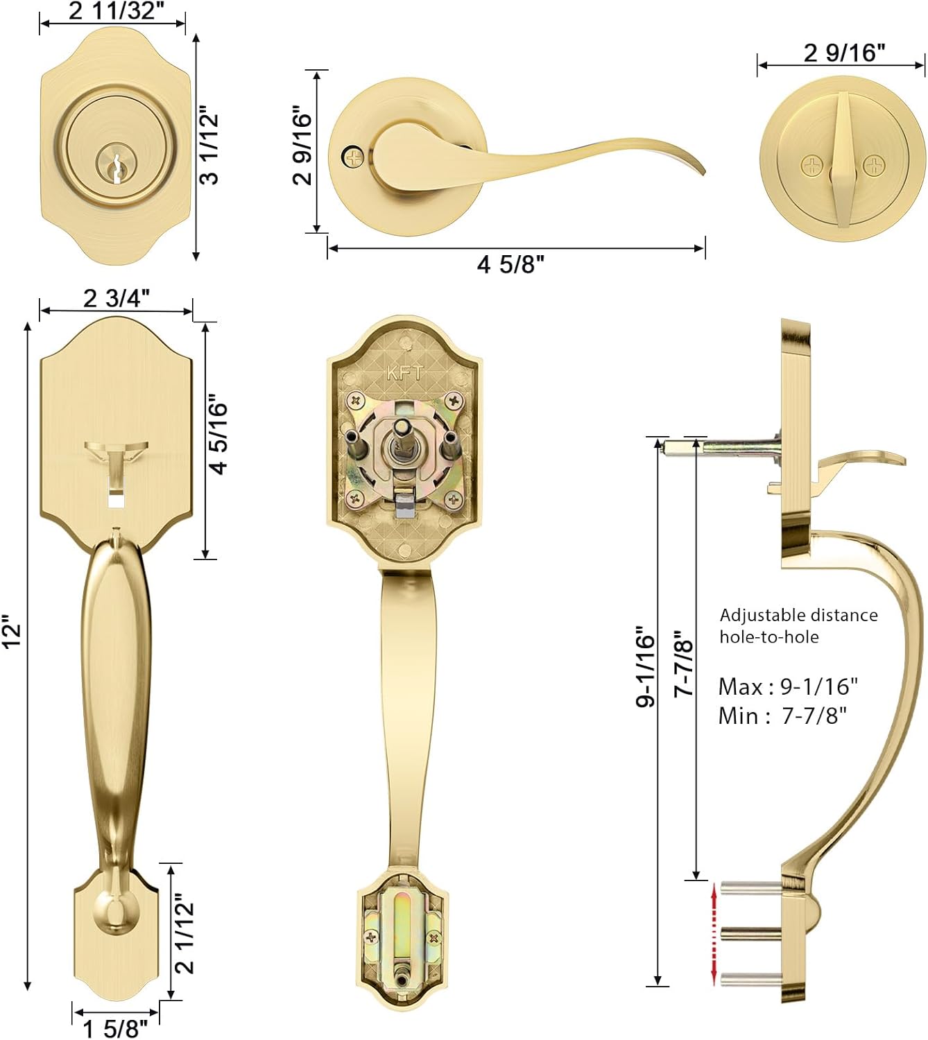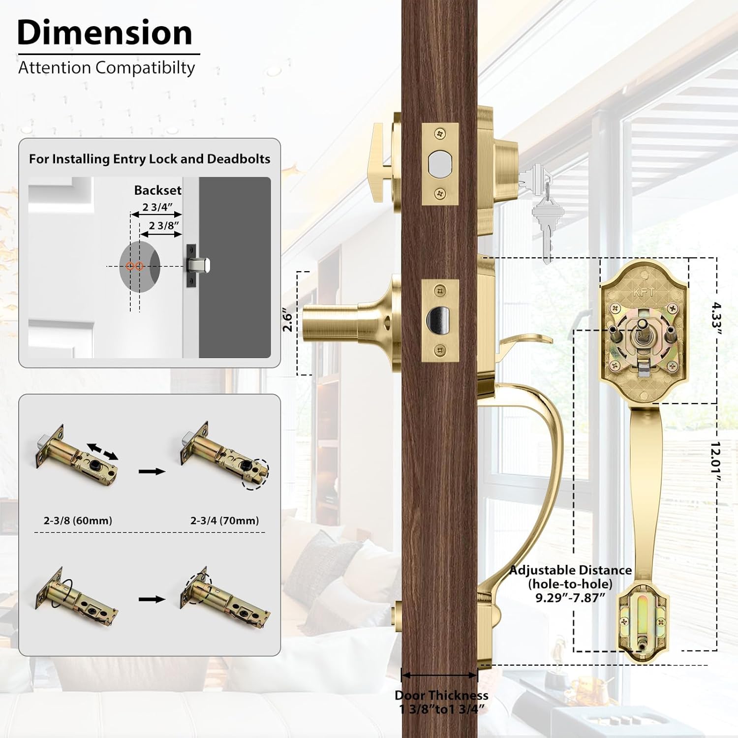 Elevate the look and security of your doors with this high-quality hardware set. Featuring a radiant gold finish, it adds a touch of elegance to both modern and traditional settings. Crafted from heavy-duty zinc alloy, it ensures durability and resilience, even in high-traffic areas. The set includes a dummy handle and a keyed deadbolt, offering enhanced security without sacrificing style. The reversible handle lever makes installation easier, as you can choose the orientation that matches your door's opening direction. With an adjustable backset design (2-3/8" to 2-3/4"), it's compatible with a variety of door thicknesses and configurations. Perfect for residential or commercial use, this set is a reliable choice for securing your entry points while enhancing your home's curb appeal.