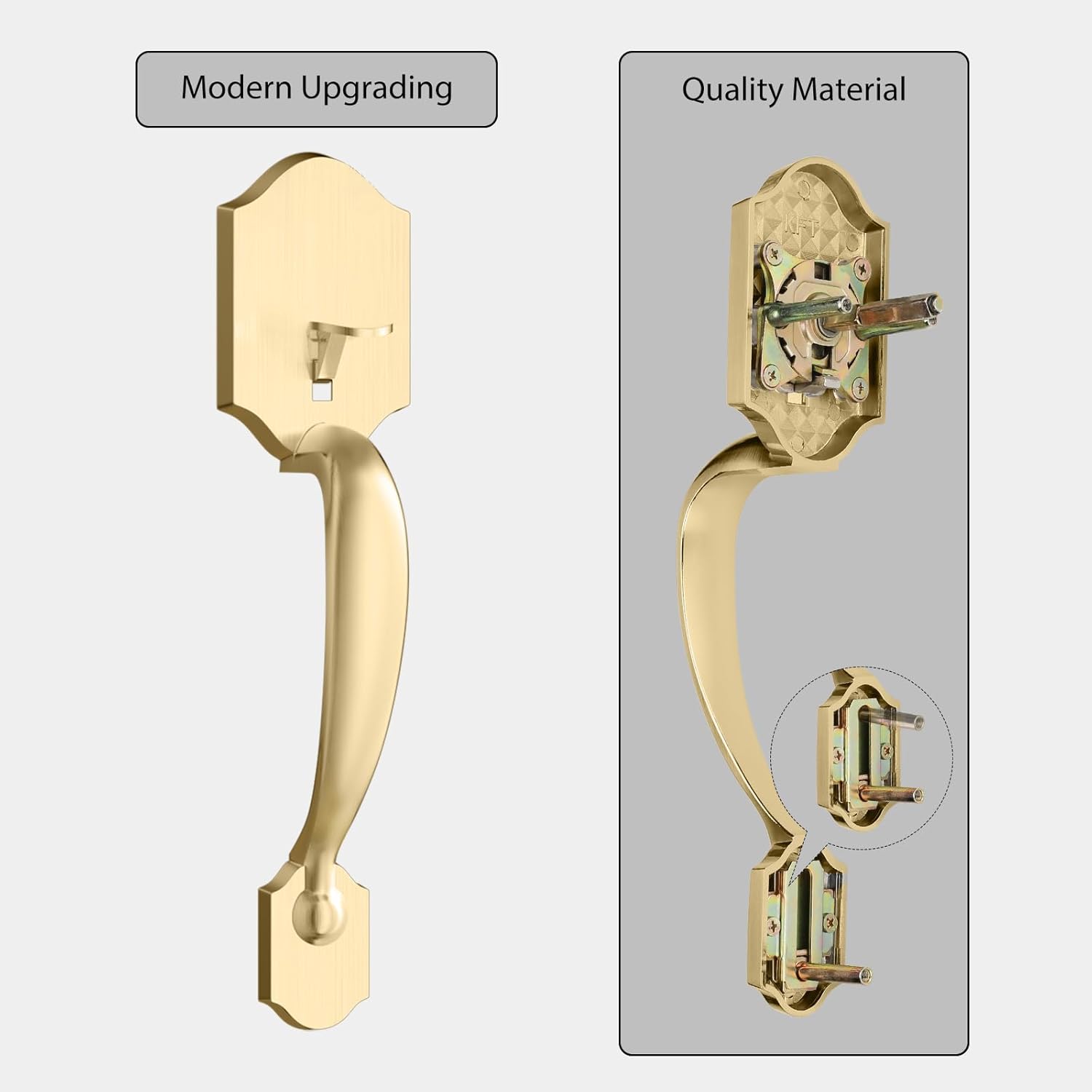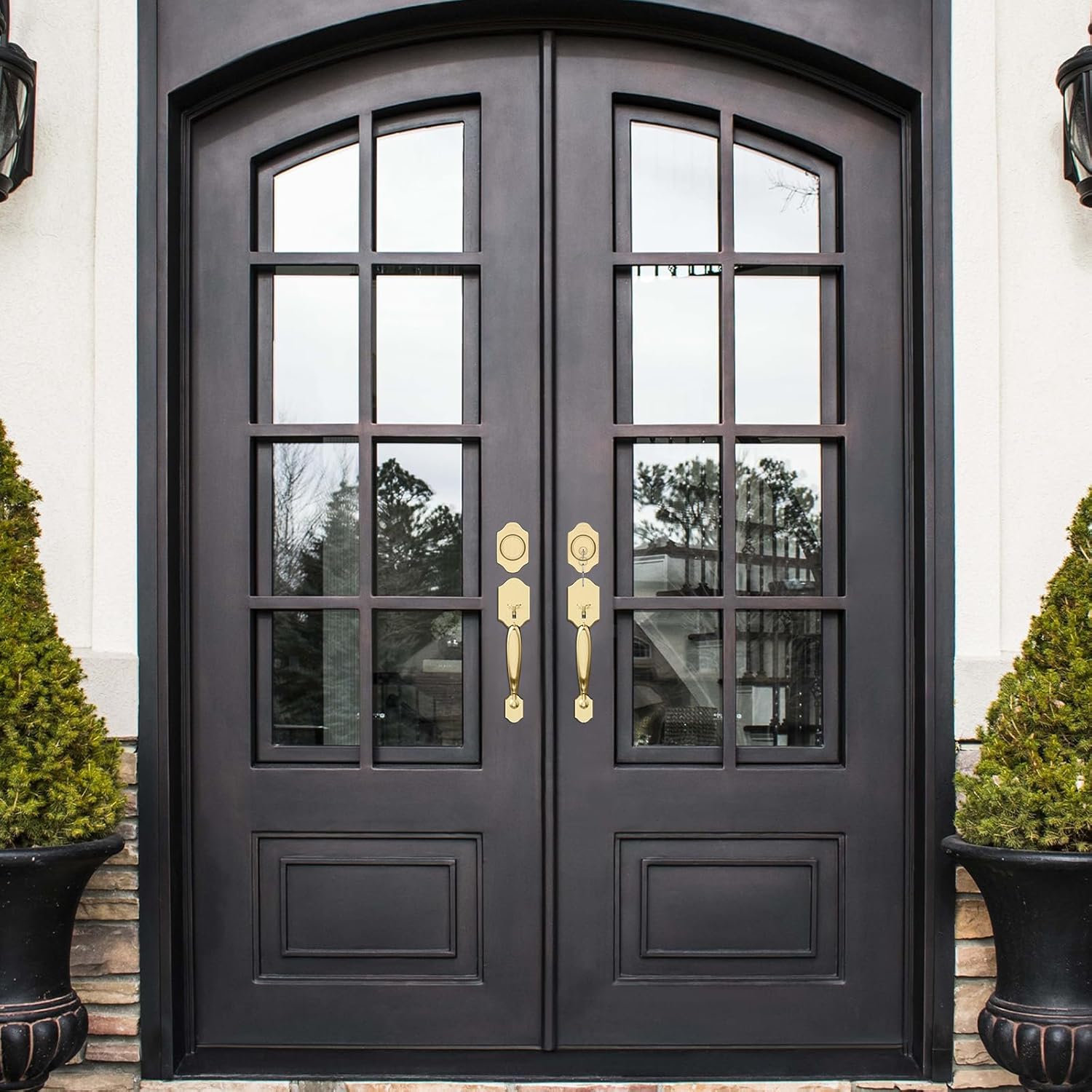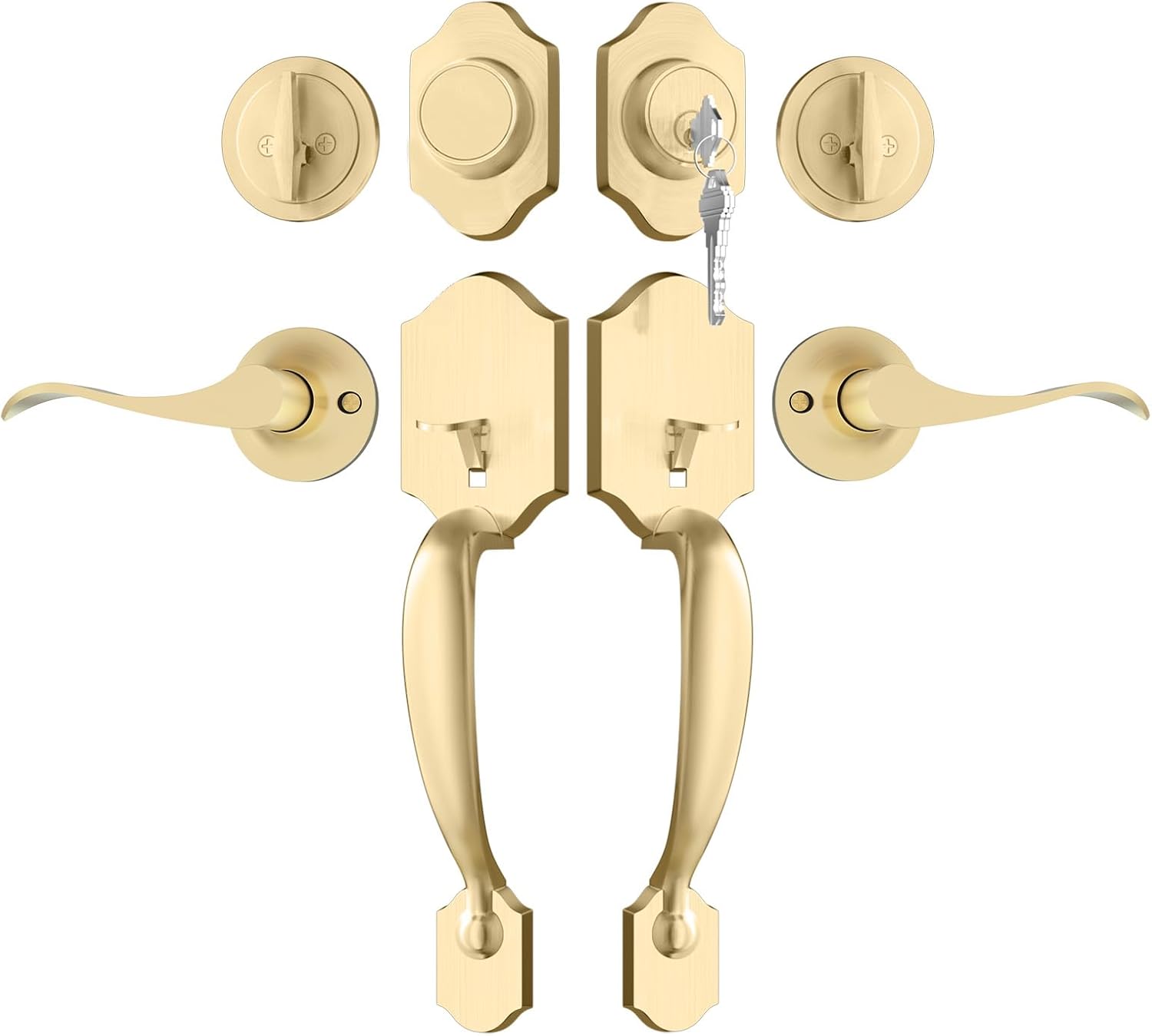 Elevate the look and security of your doors with this high-quality hardware set. Featuring a radiant gold finish, it adds a touch of elegance to both modern and traditional settings. Crafted from heavy-duty zinc alloy, it ensures durability and resilience, even in high-traffic areas. The set includes a dummy handle and a keyed deadbolt, offering enhanced security without sacrificing style. The reversible handle lever makes installation easier, as you can choose the orientation that matches your door's opening direction. With an adjustable backset design (2-3/8" to 2-3/4"), it's compatible with a variety of door thicknesses and configurations. Perfect for residential or commercial use, this set is a reliable choice for securing your entry points while enhancing your home's curb appeal.