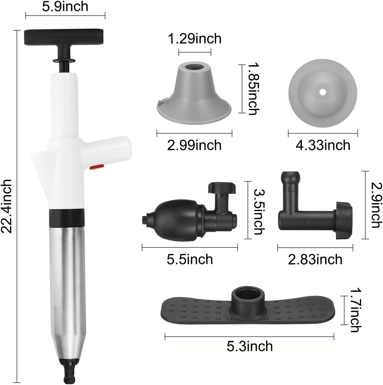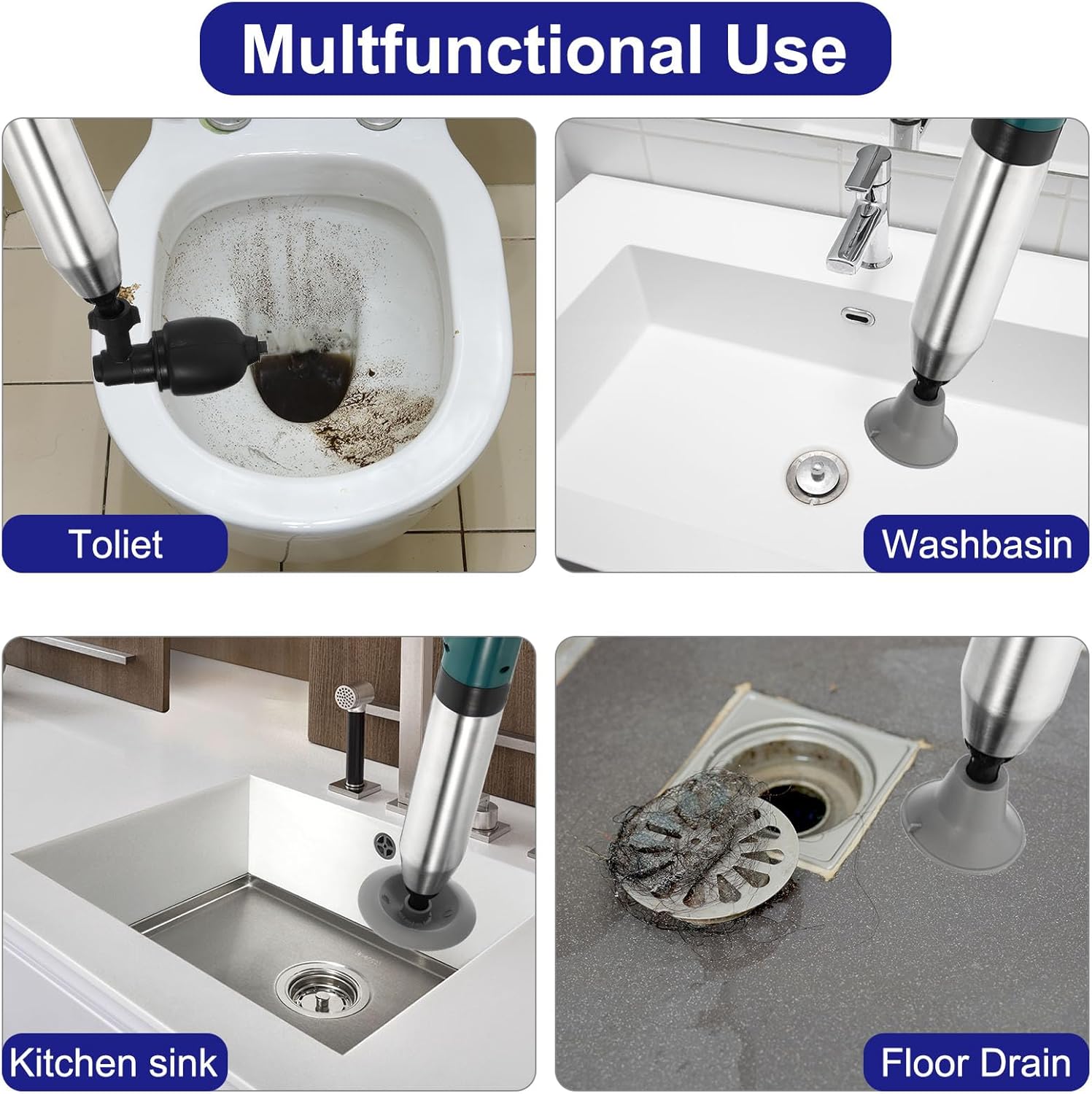 With four interchangeable heads, this plunger is designed to tackle different types of clogsâwhether it's hair, cloth, oil, or other debris. The innovative setup includes air tubing that makes it easy to use in tight spaces, providing a clean and efficient way to restore water flow. No more waiting for a plumber or wasting time on ineffective methods. This is clog removal made simple.