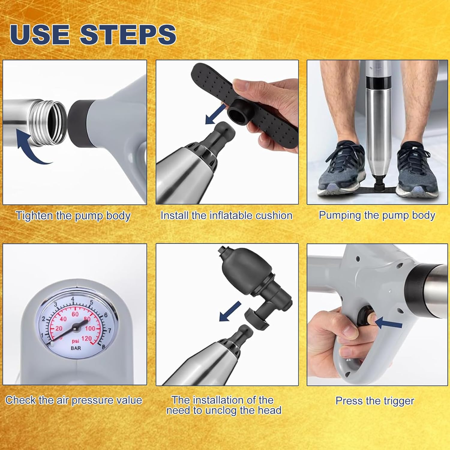 This advanced toilet plunger is engineered to eliminate stubborn clogs in sinks, toilets, and showers with ease. Its unique design incorporates high-pressure compressed air to deliver fast, reliable clearing without the need for excessive force. Whether youâre dealing with a minor blockage or a major buildup, this tool ensures a clean and hassle-free experience every time.