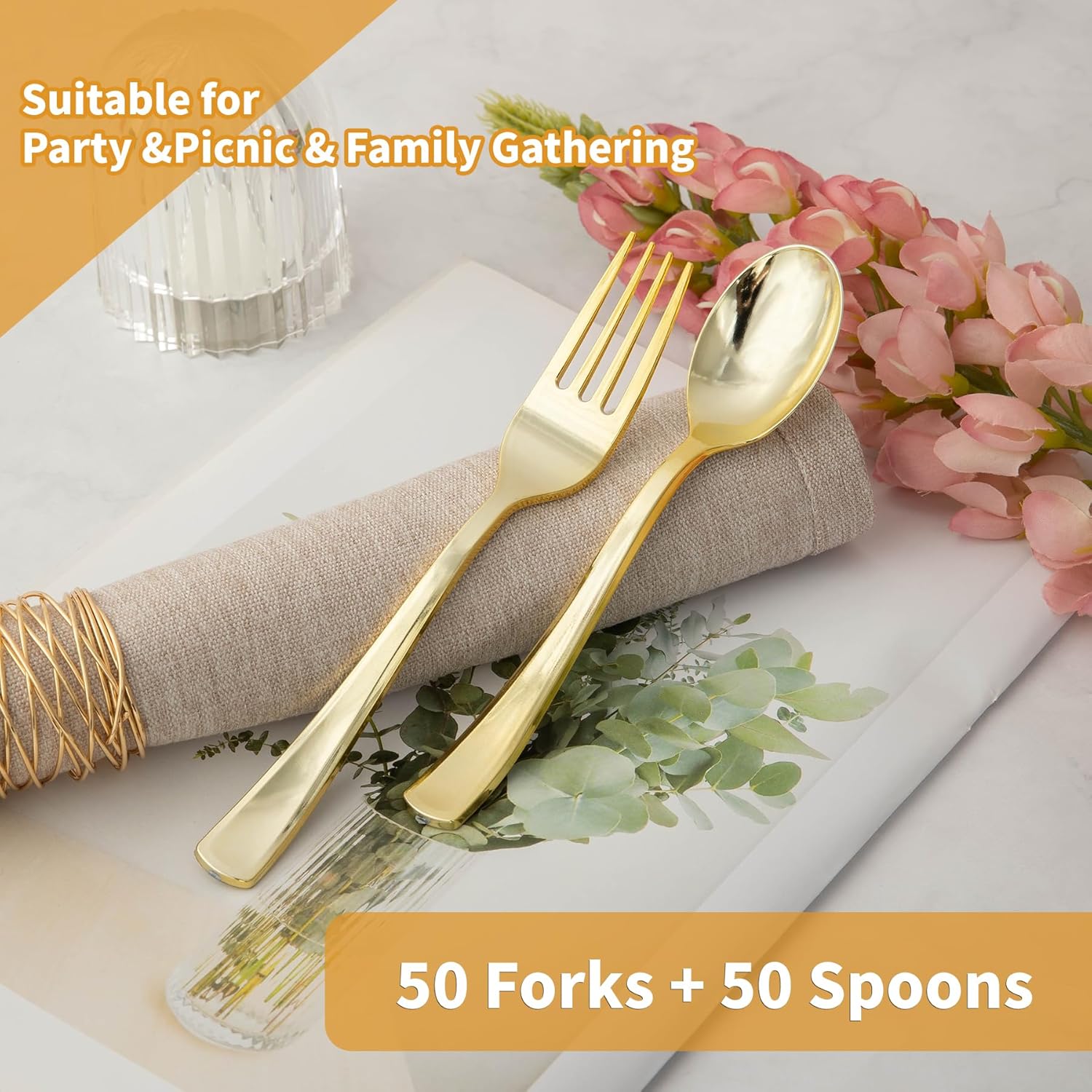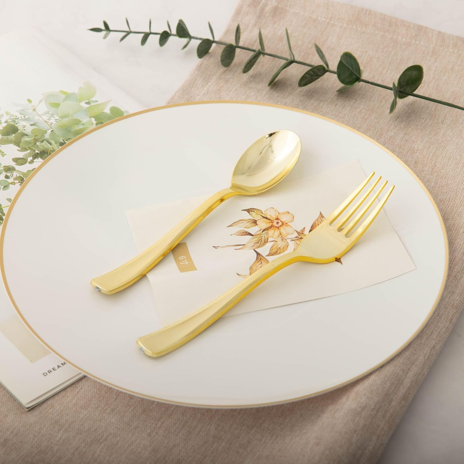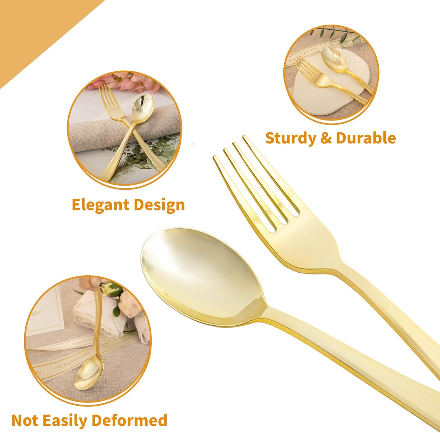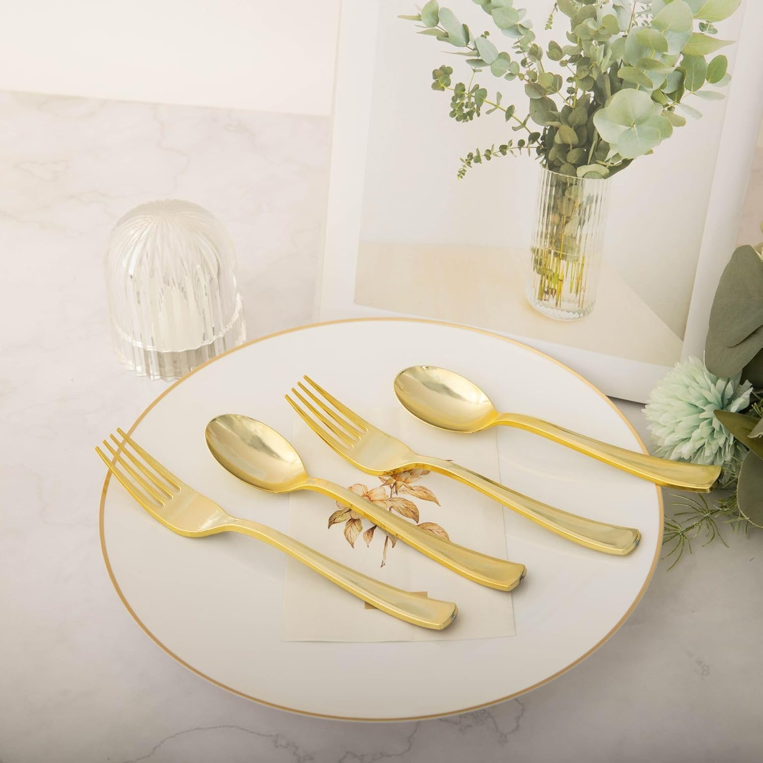 Elevate your dining experience with our beautiful gold-plated plastic silverware set. Perfect for parties, dinners, and weddings, these elegant utensils bring a touch of sophistication to any gathering. Created from premium, food-grade plastic, they are built to be strong, long-lasting, and resistant to bending or breaking during use.