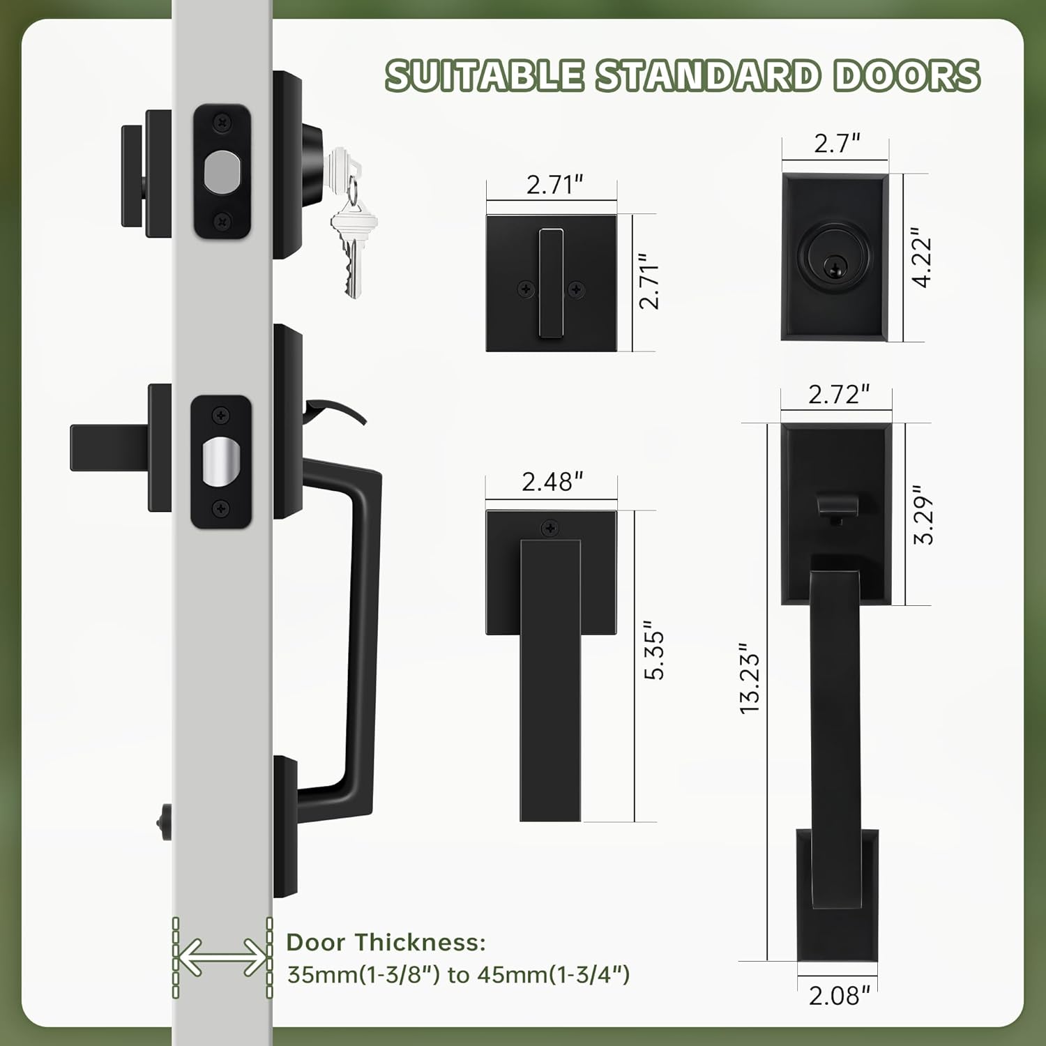 With an adjustable through-bolt, this lock set is versatile and adapts to different door heights. The reversible handle makes installation simple, allowing for a secure and precise fit regardless of door size or orientation. For added convenience, the deadbolt features exterior key access and an interior thumb-turn, making it easy for both homeowners and guests.