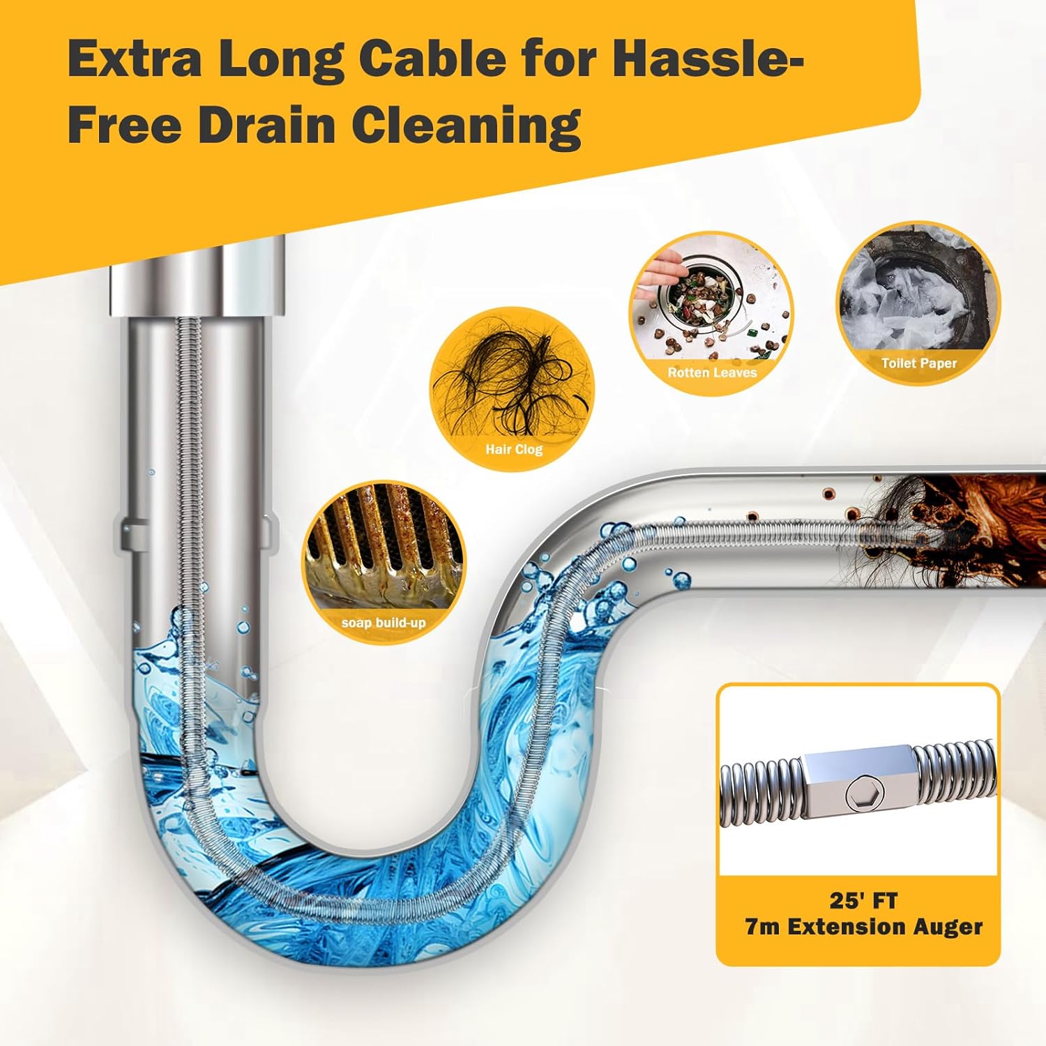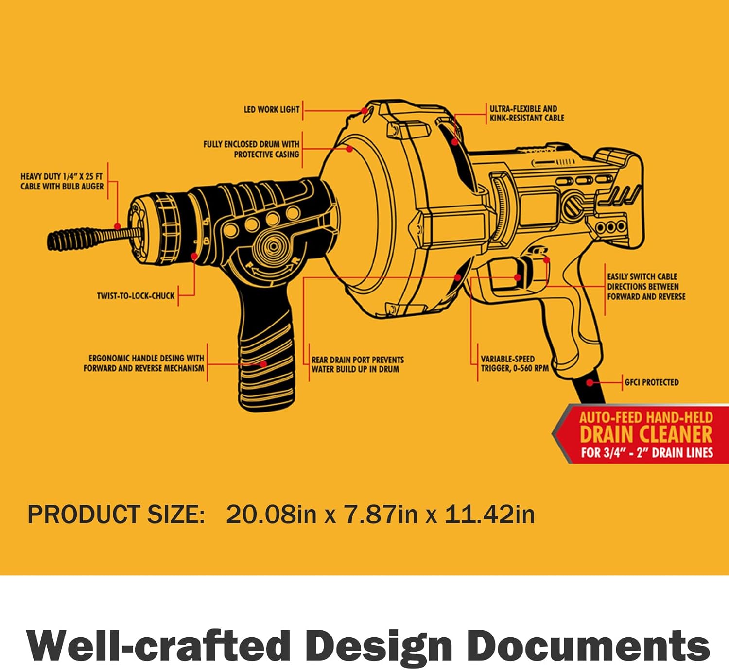 This electric drain cleaner is the perfect combination of power and precision, ideal for both residential and professional plumbing tasks. With its auto-feed handle, you can effortlessly control the drum and cable rotation without ever touching the cable, reducing strain and increasing efficiency. The replaceable cable with a bulb auger head ensures long-lasting durability and the ability to tackle even the most stubborn blockages. The built-in LED light gives you better visibility in tight spaces, while the variable speed control lets you adjust from 0 to 560 RPM, giving you the power you need without causing unnecessary damage. Whether you're dealing with a simple clog in your home or a more complex pipe issue in a commercial setting, this tool is built to deliver consistent, reliable performance with minimal mess and maximum results.