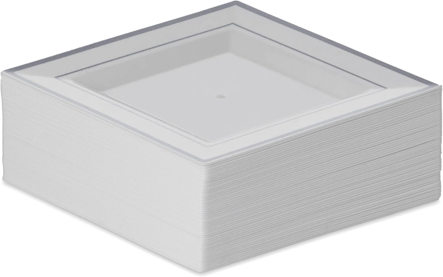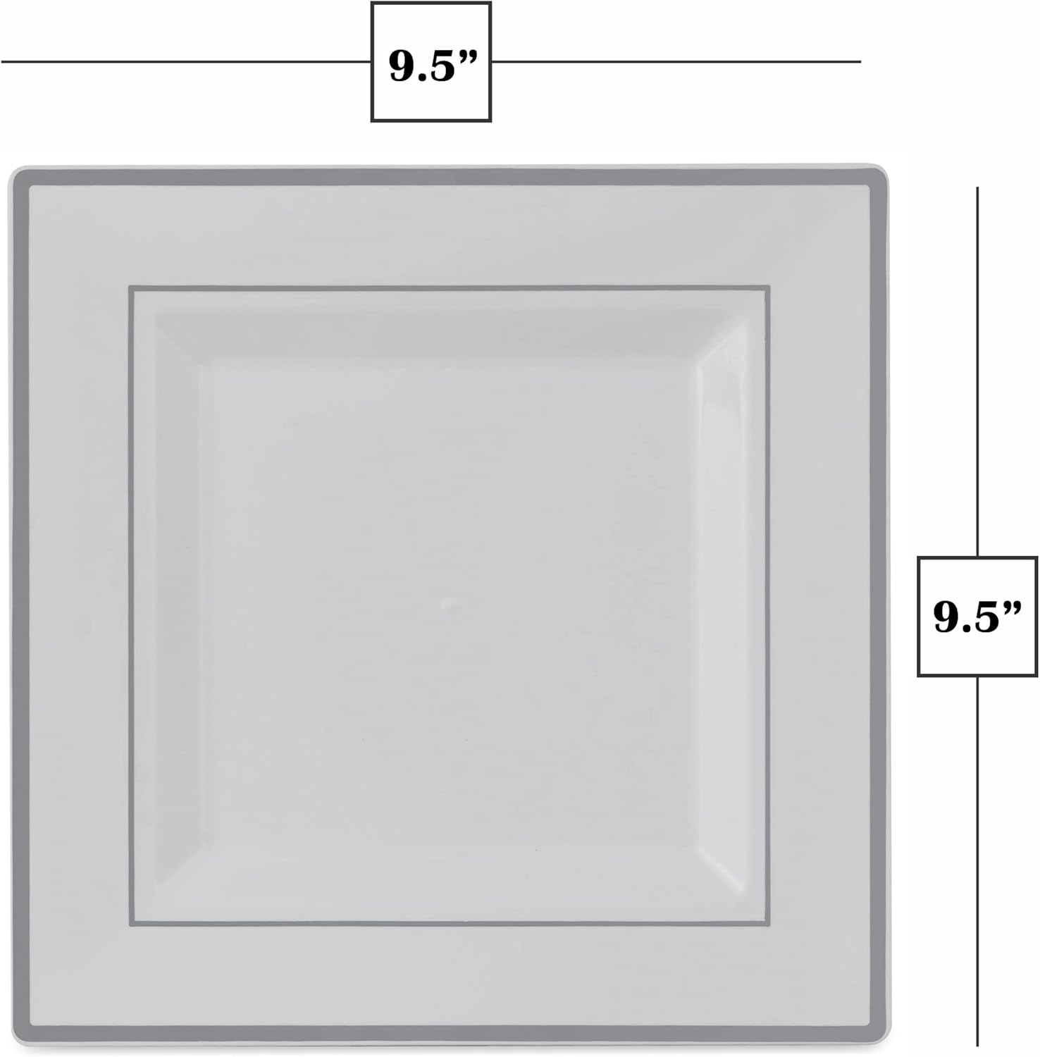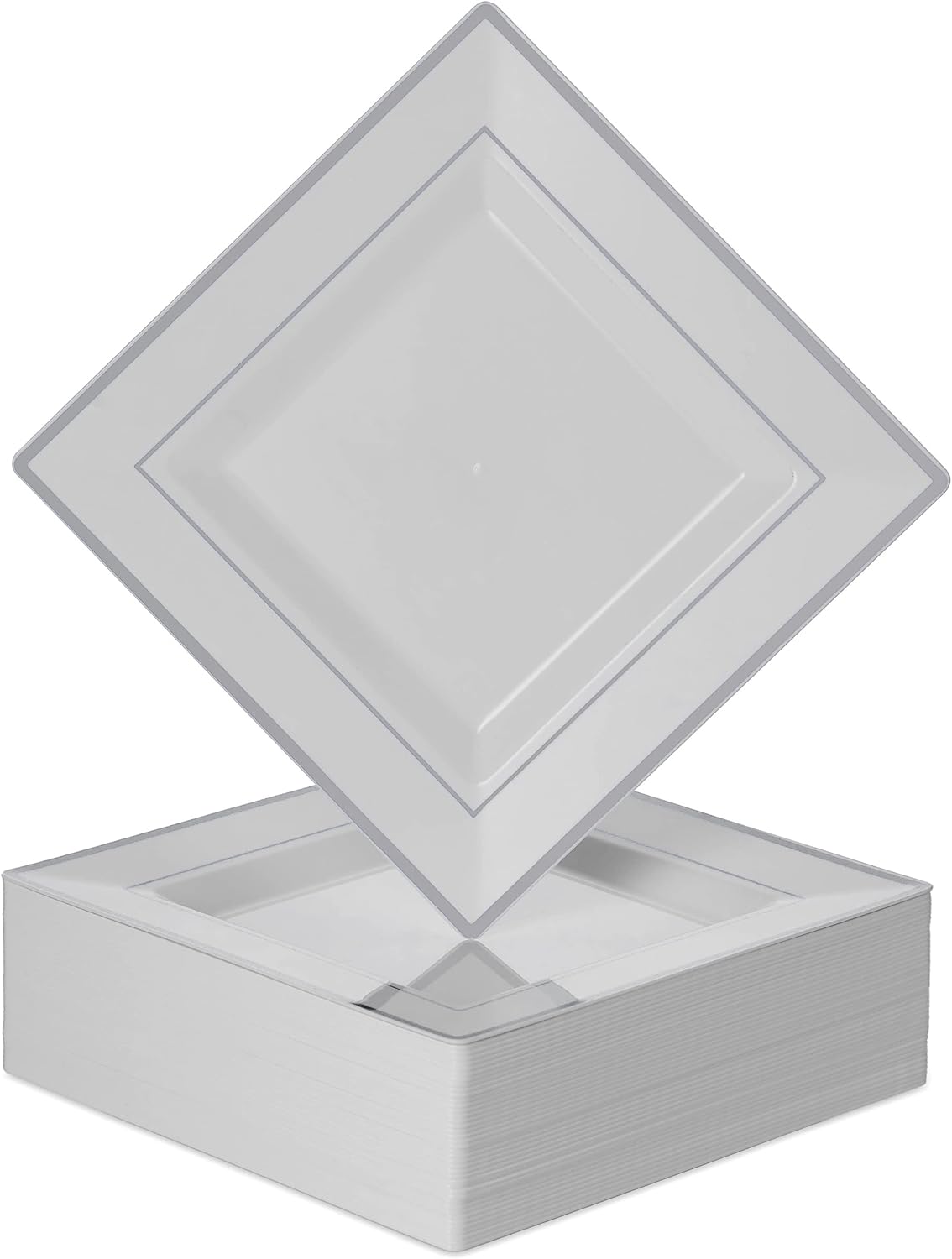 Get 50 pack stackable disposable dinner plates in 9.5-inch white with silver rim. Easy to clean, safe, and perfect for any occasion.Enumerable style and convenient to use in weddings, caterings, or parties. Non-toxic, heavy-duty plates for a safe and enjoyable experience.