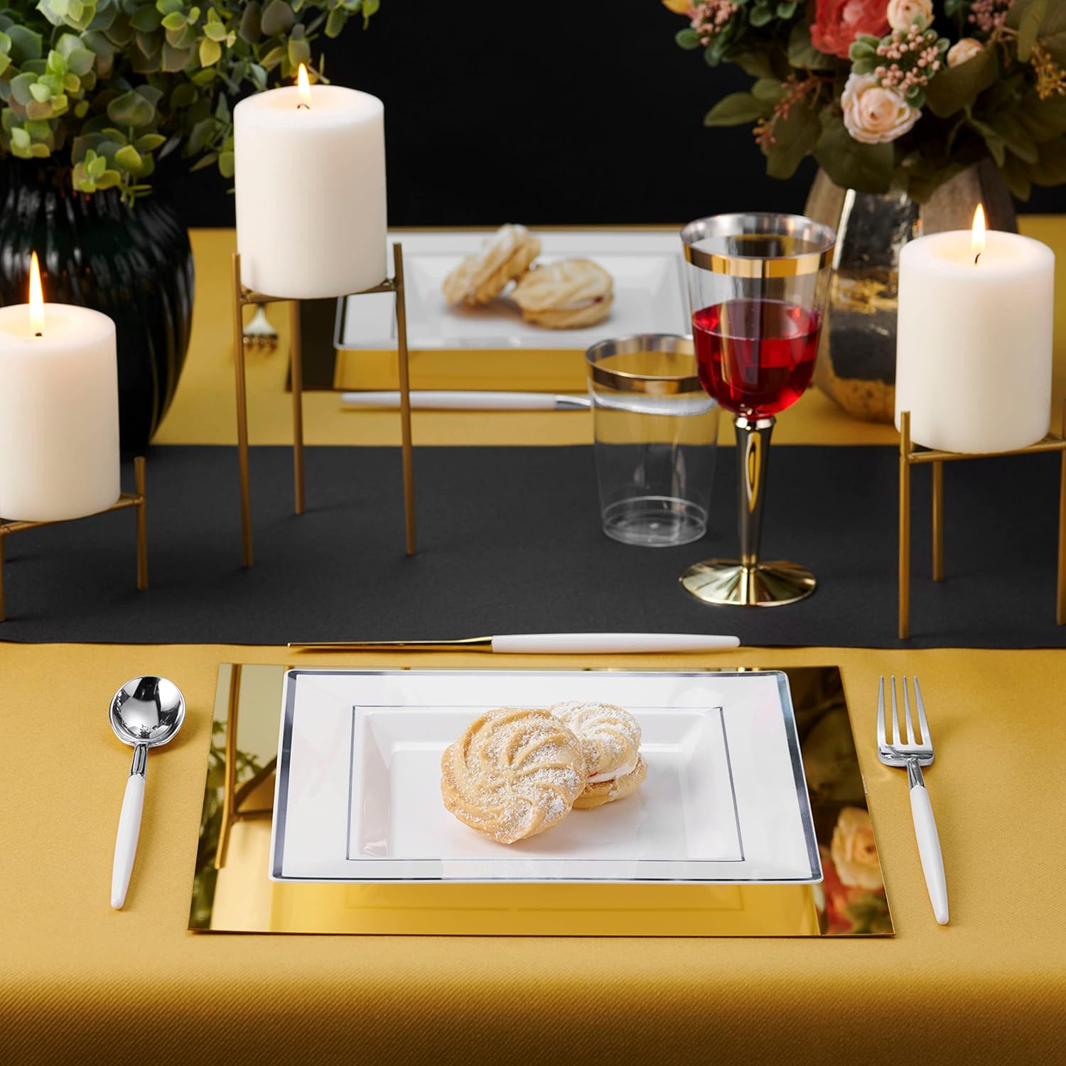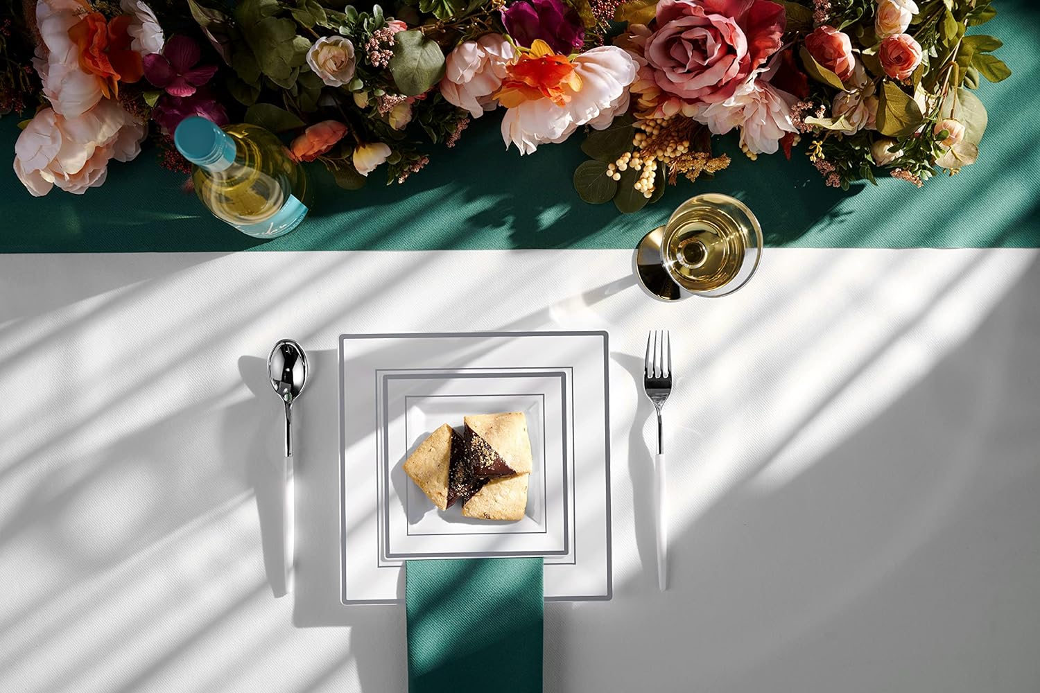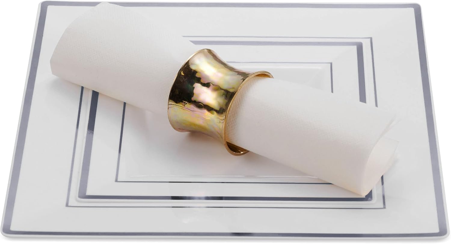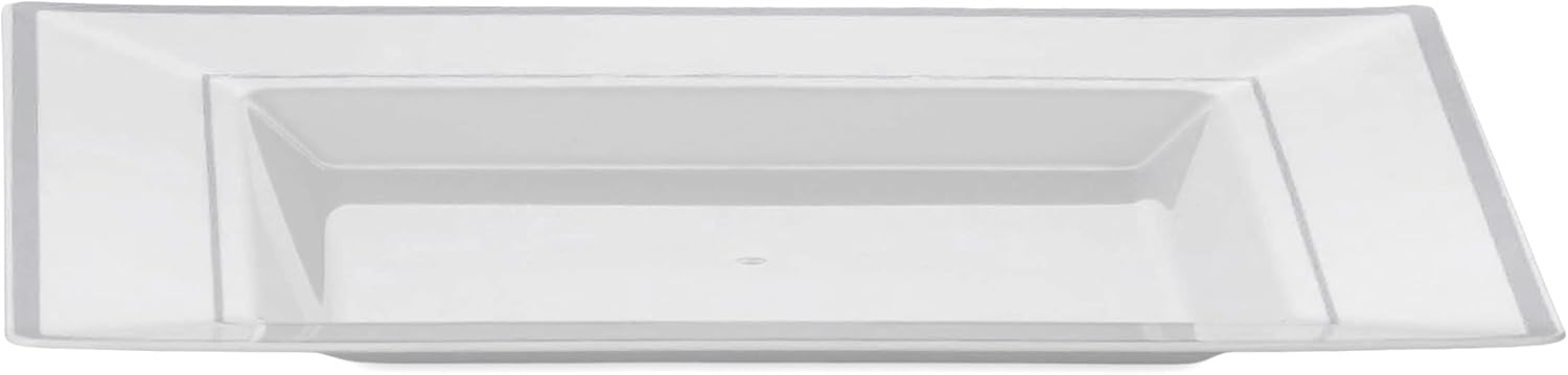 Get 50 pack stackable disposable dinner plates in 9.5-inch white with silver rim. Easy to clean, safe, and perfect for any occasion.Enumerable style and convenient to use in weddings, caterings, or parties. Non-toxic, heavy-duty plates for a safe and enjoyable experience.